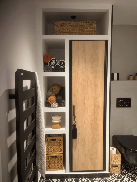 Notre cliente nous ont sollicités pour un projet passionnant : la rénovation complète de sa salle de bain et WC, ainsi que l’aménagement sur mesure de leur couloir d’entrée. L’objectif était de transformer ces espaces pour les rendre plus fonctionnels, modernes et esthétiques, en s’appuyant sur des matériaux haut de gamme et un design sur-mesure.