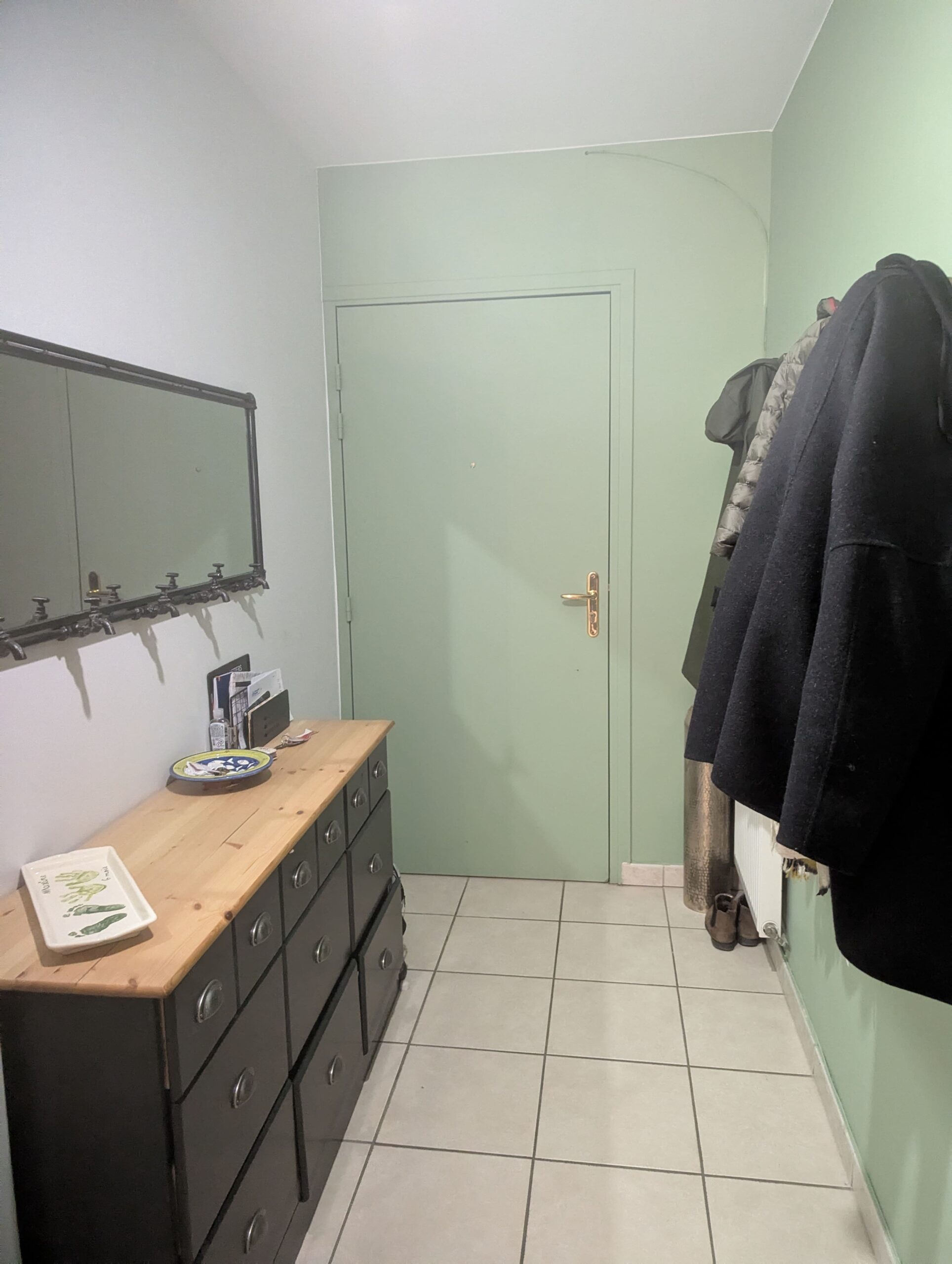 Entrée/Couloir : Fabrication et pose d’un grand placard sur mesure avec une façade battante (1000×2400) et une chapelière intégrée. Une façade pivotante a également été installée pour masquer le tableau électrique.