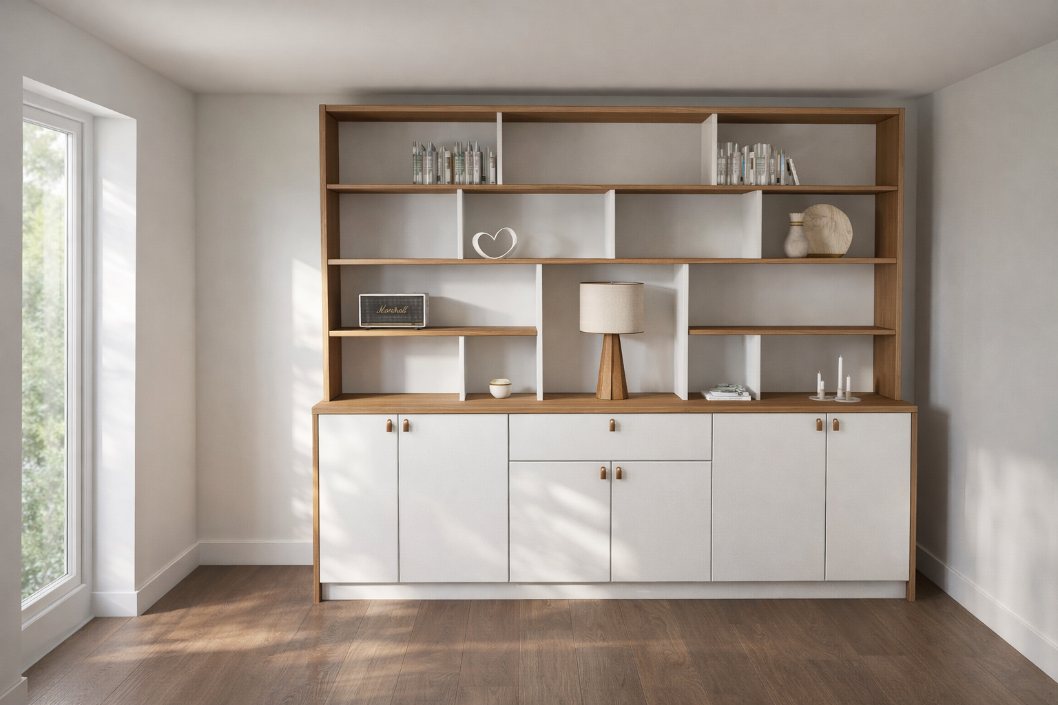 - Une profondeur asymétrique où le meuble bas offre 55 cm de profondeur pour ranger aisément vaisselle, dossiers ou jeux de société, tandis que la partie haute de 35 cm reste aérienne, idéale pour les livres et la décoration.