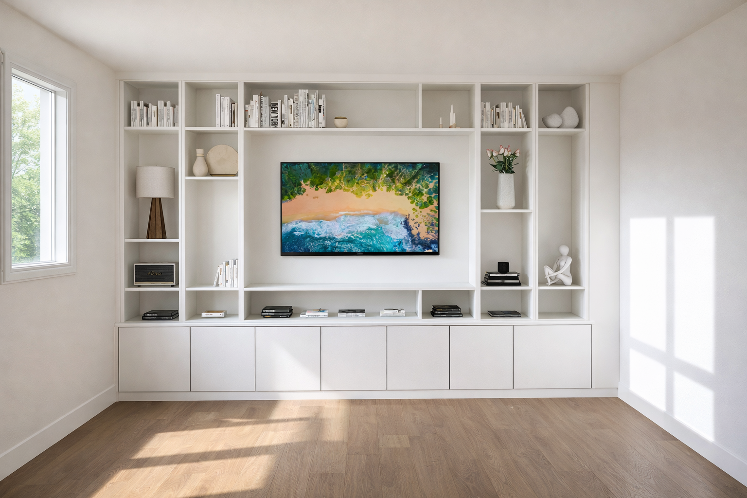 - Un aménagement complet avec une belle envergure de 4 mètres de largeur conçue pour épouser toute la hauteur sous plafond et garantir une intégration visuelle parfaite.