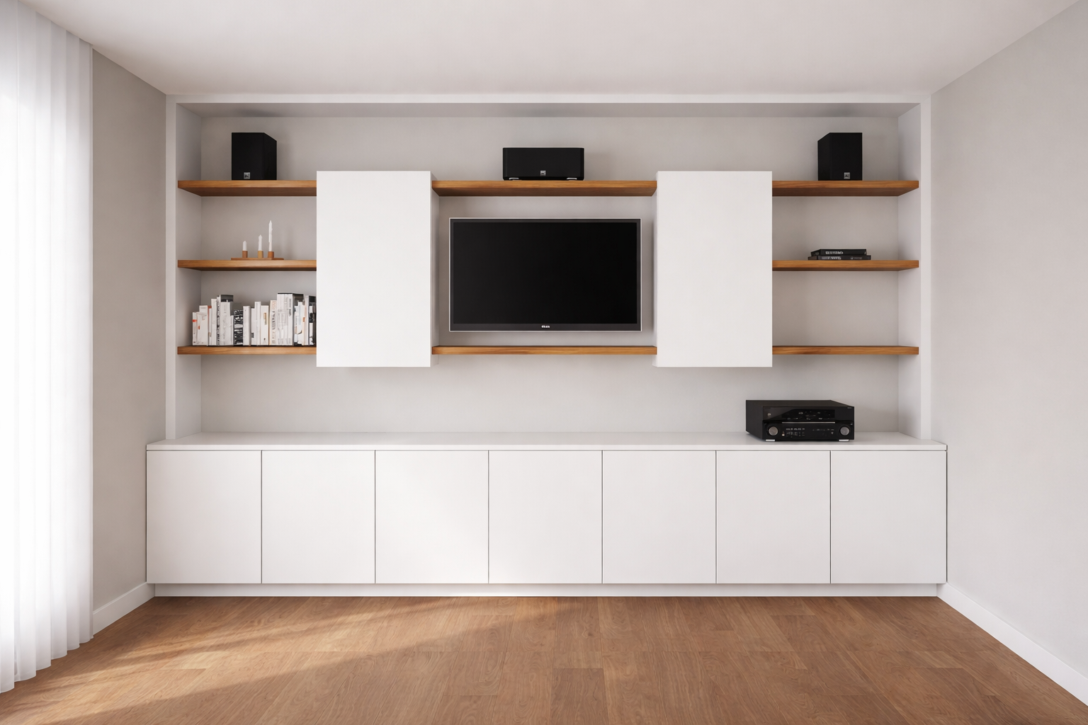 - Un espace TV modulable doté d’une niche centrale encadrée par deux portes coulissantes montées sur un système invisible pour une fluidité de mouvement irréprochable.