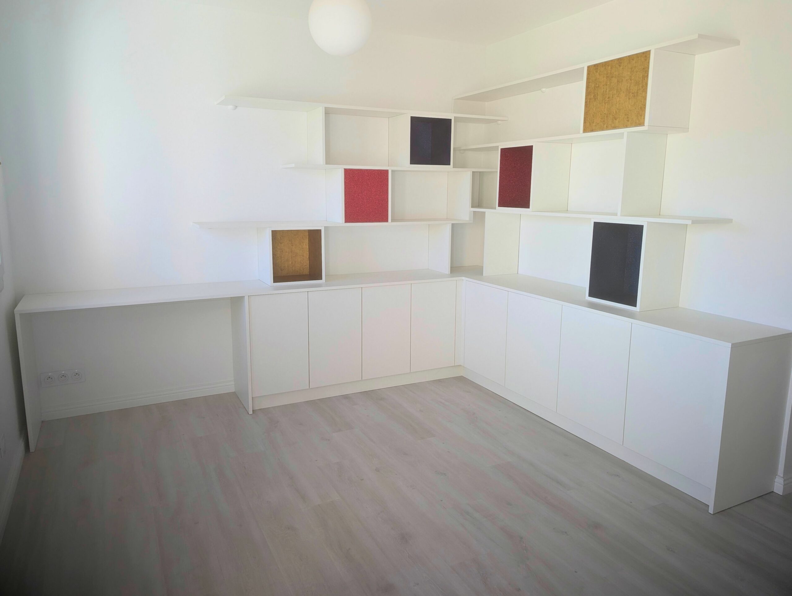 : une structure déstructurée alliant rangements bas fermés et étagères ouvertes , idéale pour un espace de travail intégré et esthétique.
