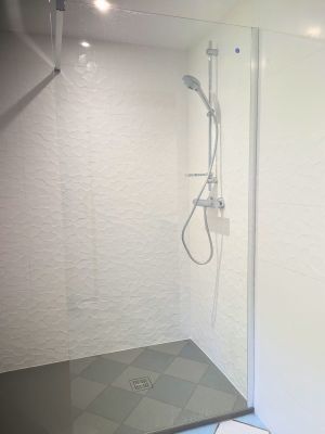 Pour rendre la salle de bains plus fonctionnelle et esthétique, une douche extra-plate sur mesure a été installée, occupant toute la largeur de la pièce pour un confort optimal. Le choix soigné de la couleur du receveur a participé à l’harmonie globale.