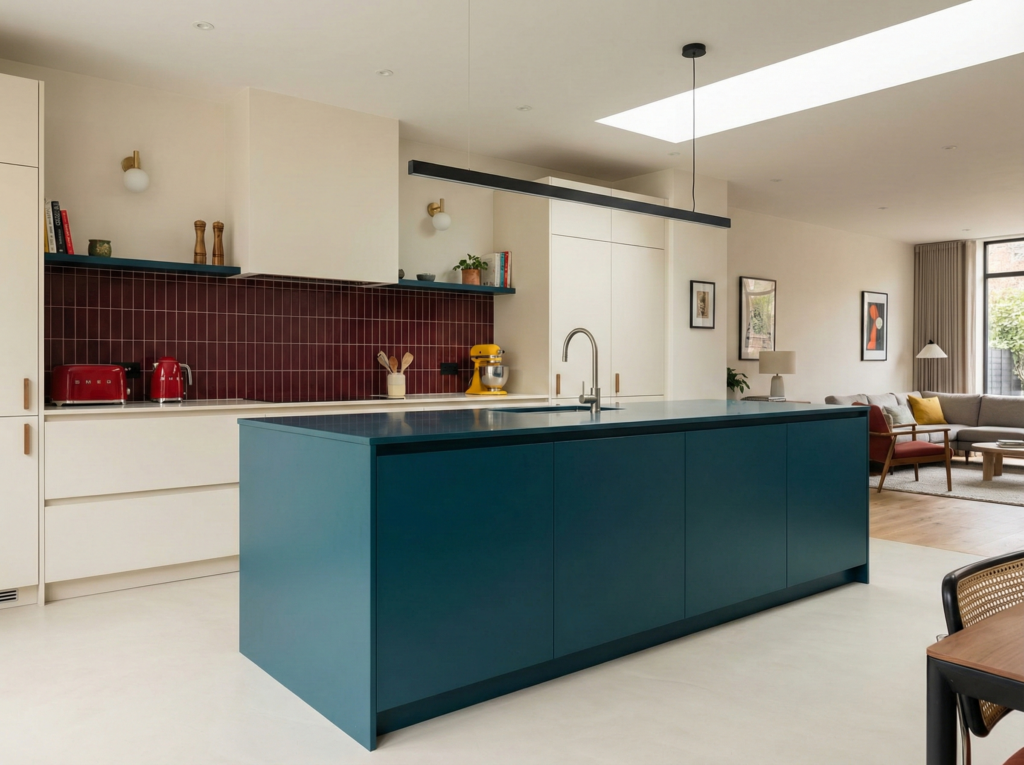 • Configuration : Une base neutre (crème ou magnolia) dynamisée par un îlot central monumental en bleu pétrole ou vert olive.